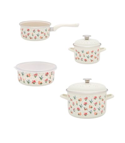 Zestaw 4 naczyń emaliowanych Flowers – garnki 2l + 6,75 l, rondel 2 l i pojemnik 1,3 l