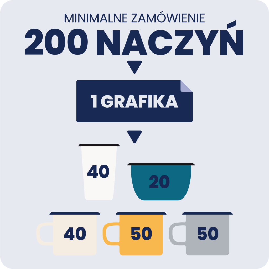 Minimalna ilość zamówienia to 200 sztuk, istnieje jednak możliwość zamówienia produktów z tą samą grafiką na różnych naczyniach, w różnych kolorach.