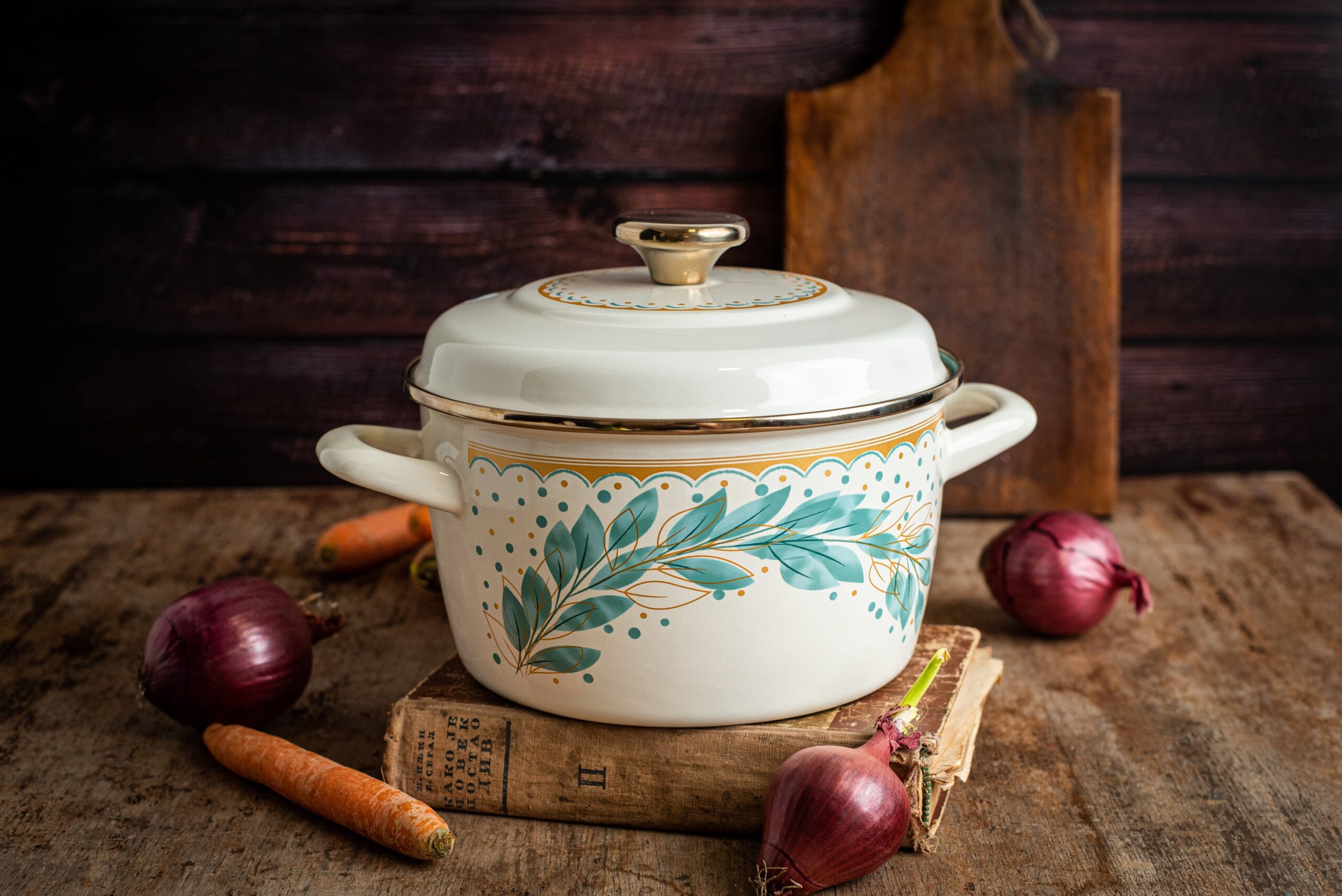 Garnek emaliowany o pojemności 3,5 litra z kolekcji Green Line to doskonały wybór dla osób, które cenią sobie elegancję w kuchni. Złote wykończenia i finezyjny roślinny wzór sprawiają, że garnek ten staje się ozdobą każdej kuchni – zarówno tej urządzonej w stylu klasycznym, jak i nowoczesnym. Powłoka emaliowana gwarantuje, że jedzenie nie wchodzi w reakcję z naczyniem, co przekłada się na prozdrowotne korzyści. Garnek ten jest idealny zarówno do gotowania zup, duszenia mięs, jak i przygotowywania zdrowych posiłków.
