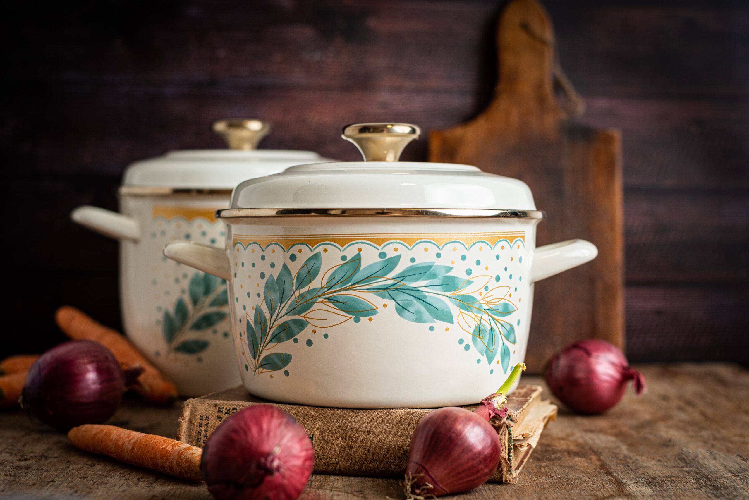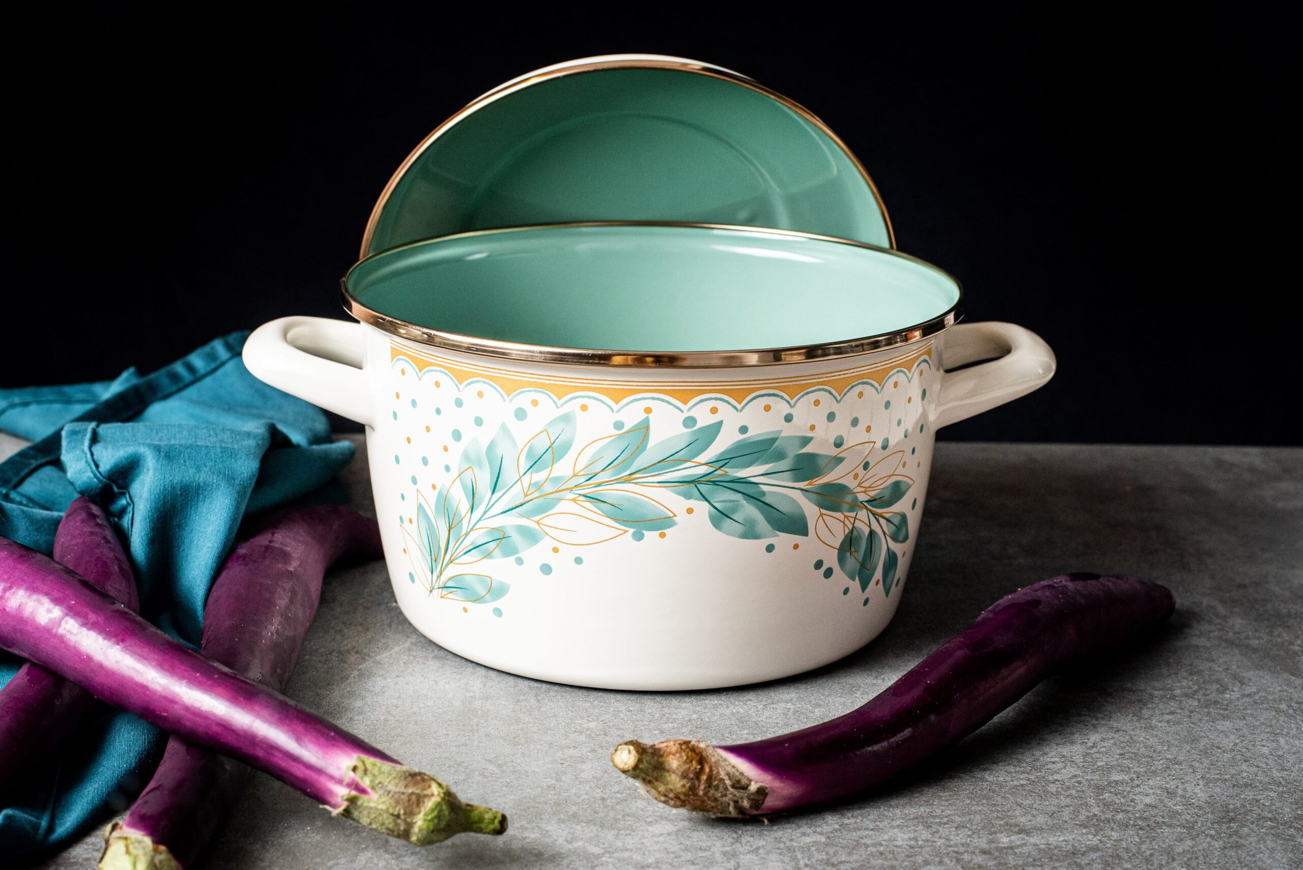 Garnek z kolekcji Green Line o średnicy 24 cm i pojemności 6 litrów, to prawdziwa perełka w każdej kuchni. Eleganckie złote akcenty oraz stylowy roślinny wzór dodają mu szyku i sprawiają, że pasuje do każdego wnętrza – od nowoczesnych po bardziej tradycyjne. Dzięki prozdrowotnym właściwościom emalii, jedzenie przygotowywane w tym garnku pozostaje naturalne i pełne smaku. Jest to idealny wybór do gotowania większych porcji, idealny na rodzinne obiady czy przyjęcia.