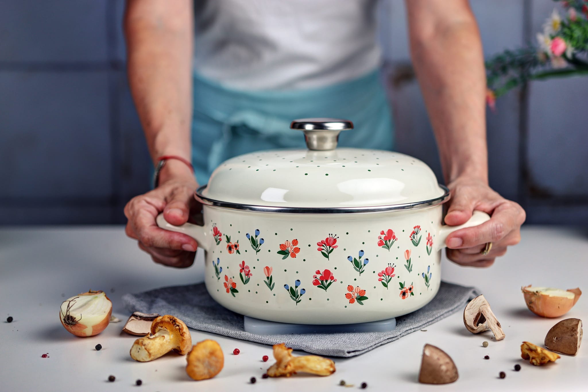 Niski garnek emaliowany 20 cm, 2,75 l, jasnokremowy, kolekcja Flowers: