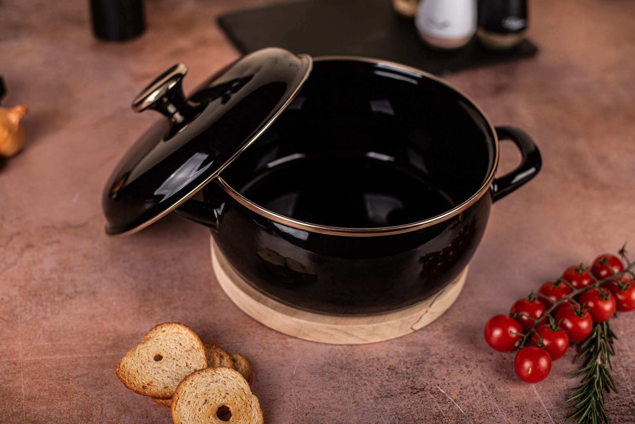 Największy z garnków w kolekcji Black, o pojemności 5 litrów, to idealny wybór do gotowania obfitych posiłków dla całej rodziny lub na większe przyjęcia. Jego elegancka, czarna emalia oraz złote detale tworzą luksusowy efekt, który podkreśli wyjątkowość każdego gotowanego w nim dania. Doskonałe rozprowadzanie ciepła i solidna konstrukcja sprawiają, że jest to naczynie, które spełni oczekiwania nawet najbardziej wymagających kucharzy.