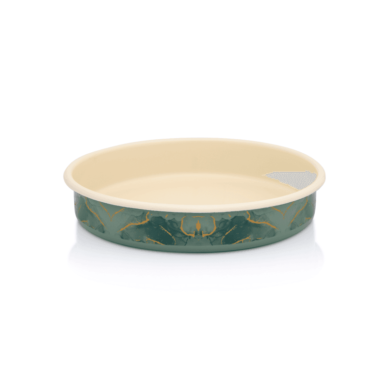 Emaliowana okrągła forma do pieczenia z kolekcji Marble o średnicy 28 cm to piękne naczynie w miętowym kolorze, zdobiona subtelnymi marmurkowymi wzorami, doskonale sprawdzi się w każdej kuchni, łącząc elegancję z funkcjonalnością. Wykonana z wysokiej jakości stali pokrytej emalią, gwarantuje równomierne rozprowadzanie ciepła, co sprawia, że Twoje wypieki będą zawsze perfekcyjnie upieczone. Dzięki gładkiej powierzchni jest łatwa do czyszczenia i bezpieczna dla zdrowia, nie wchodzi w reakcje z jedzeniem.