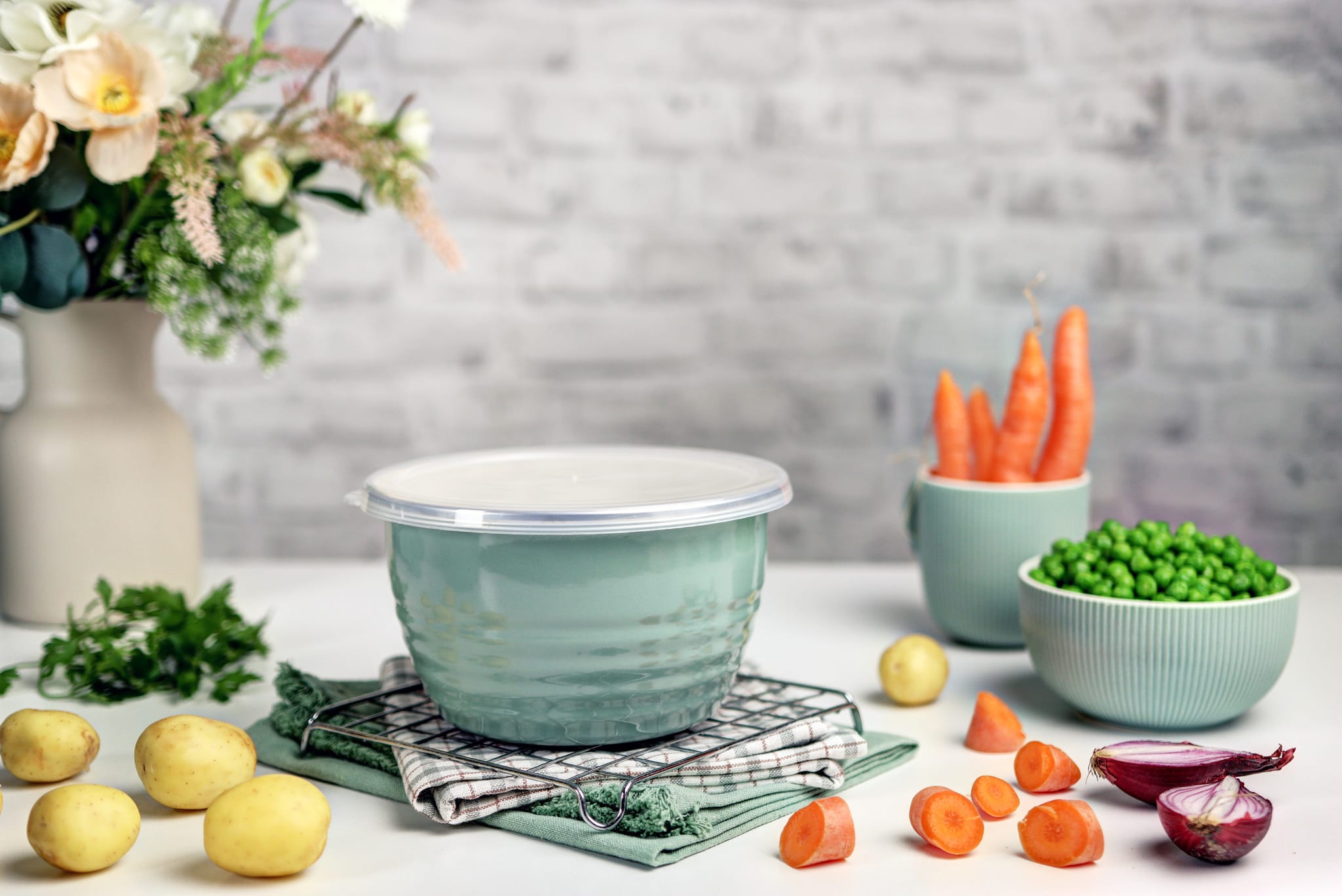 - Pojemnik emaliowany z kolekcji Waves w zielonym odcieniu to doskonałe rozwiązanie do przechowywania żywności.