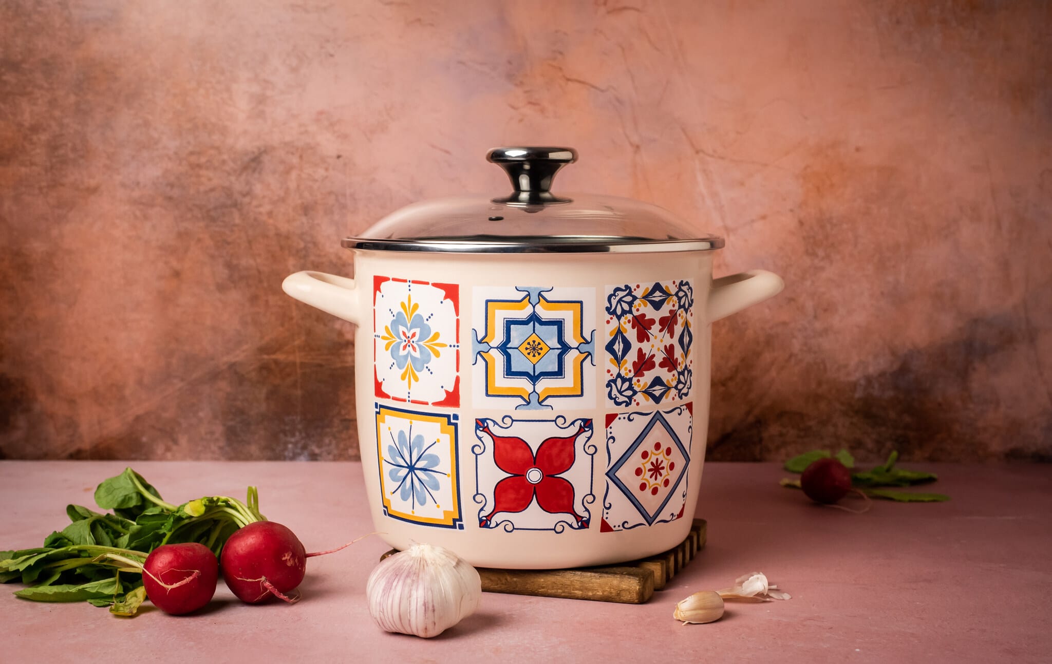 Ten elegancki garnek o średnicy 20 cm i pojemności 5.1 litra to zwieńczenie kolekcji Porto, która zachwyca swoim unikalnym stylem inspirowanym portugalskimi kaflami. Jego patchworkowe wzory w połączeniu z pastelową kolorystyką idealnie pasują zarówno do klasycznych, jak i nowoczesnych kuchni, wprowadzając niepowtarzalny, śródziemnomorski klimat. Emaliowana powierzchnia sprawia, że naczynie jest nie tylko estetyczne, ale i zdrowe – nie reaguje z żywnością, a potrawy zachowują swój naturalny smak i aromat. Garnek ten jest idealny do gotowania większych porcji potraw, a szklana pokrywka pozwala na wygodne kontrolowanie procesu gotowania bez utraty ciepła. To praktyczny i stylowy element, który doskonale uzupełnia całą kolekcję Porto, stanowiąc nie tylko narzędzie do codziennego użytku, ale także ozdobę każdej kuchni.