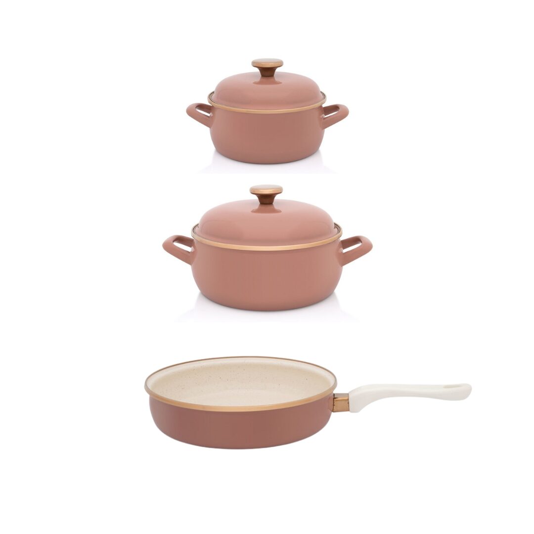 Zestaw 2 niskich garnków emaliowanych i patelni Mokka – 2,4 l + 3,8 l + patelnia 24 cm
