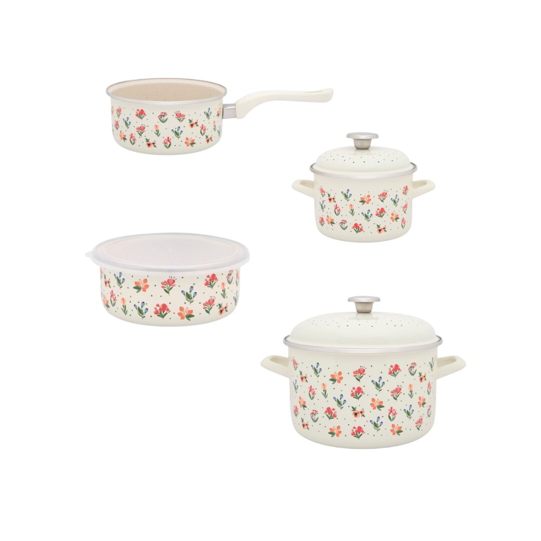 Ten czteroelementowy zestaw z kolekcji Flowers to świetna baza dla każdej kuchni. Zawiera dwa praktyczne garnki o pojemności 2 l i 6,75 l, rondel emaliowany 2 l, idealny do sosów i mleka, oraz pojemnik z pokrywką 1,3 l – świetny do przechowywania resztek, sałatek czy zup. Wszystko to w pięknym kwiatowym wzorze, który ociepli każdą przestrzeń.