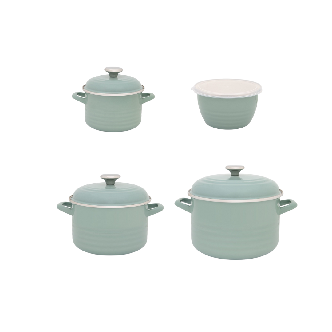 Zestaw 4 naczyń emaliowanych Waves jasnozielonych – 2 l + 4 l + 6,75 l + pojemnik 1,7 l